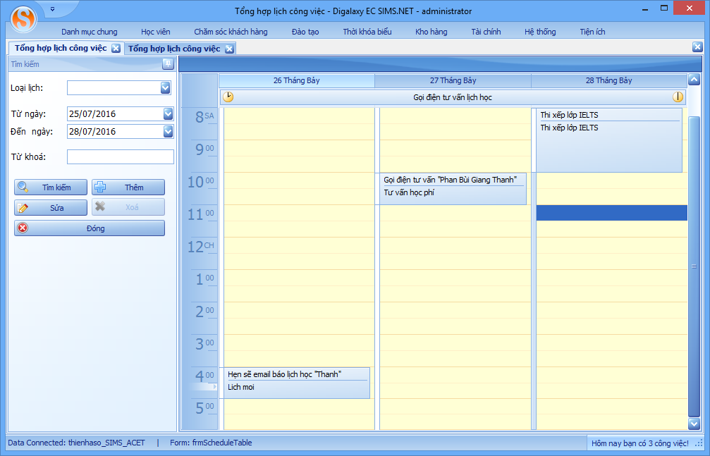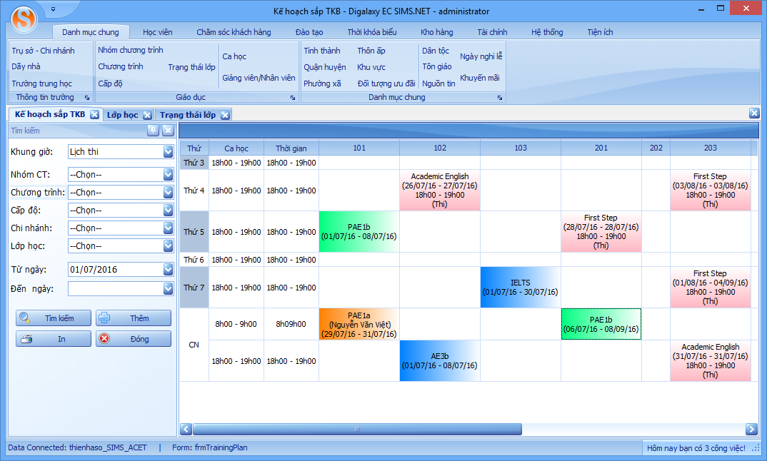 Sắp lịch thi xếp lớp cho chương trình Anh Văn, đăng ký lịch thi xếp lớp, theo dõi lịch sử tư vấn học viên, kết quả tư vấn, lịch công việc, lịch hẹn, nhắc việc,... là một số tính năng nổi bật, mới được bổ sung trong hệ thống phần mềm quản lý trung tâm Anh Ngữ Digalaxy EC SIMS.NET